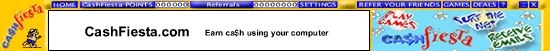 PC上にバナー広告を表示するだけで 毎月小切手をもらう方法!! 始めるにあたってお金は一切かかりません! かなりお得な海外の無料でできるプログラムです。 常時接続回線とパソコン・メルアドがあれば誰でも簡単にできます。 (紹介者ゼロでも、1日8時間の表示で1ヶ月約144ドルになります。) 2センチ幅のこのような↓をデスクトップに出しておくだけ。 このマスコットが歩いている時 つまり、マスコットが左端で歩いている状態が、ポイントがたまっている状態になります。 それではどうやって、毎月小切手をもらうのでしょうか? 詳しく解説しましょう! このCash Fiestaは、ネットサーフィン中 Fiesta Bar と呼ばれる広告バーを利用して広告を見ます。 (パソコン画面の最上段または最下段に、高さ2センチほどの広告を表示させるバー;見本は上) 広告バーの使用時間に制限はありません。極端なことを言えば、1日24時間稼動させてもOKですが、 12時間以上接続していると怪しまれるという『うわさ』がありますので、注意してください。 ネットサーフィンをしながらは当然のこと、ワープロなどを使ってお仕事中でも課金されていきます。 つまりブラウザを開いていなくてもバーが表示されていれば課金されるのです。 (ただし、マスコットが課金モード ポイントは6秒ごとに1ポイント 1時間 600ポイントとかなりのペースです。 ポイントはリアルタイムに表示されるので、見ているだけでも楽しいですよ。 支払はドルの小切手で送られてくるので、換金するのが楽しみ・・・♪♪♪ 50ドル単位から換金することができますが、換金するには1枚毎に手数料がかかるので注意してね ★★ダウンメンバーからの収益★★ このようなプログラムの特色は、自分ひとりが広告を見るだけではなく、友人知人に紹介すると、 その紹介に対する謝礼も、紹介者の利用頻度に合わせて報酬に上乗せされるということです。 たいていのプログラムでは、あなたから4〜8世代下の ダウンの利用状況までが、あなたの報酬に反映されます。 あなたの獲得ポイントにダウンメンバーの利用頻度に応じたポイントが加算されます。