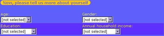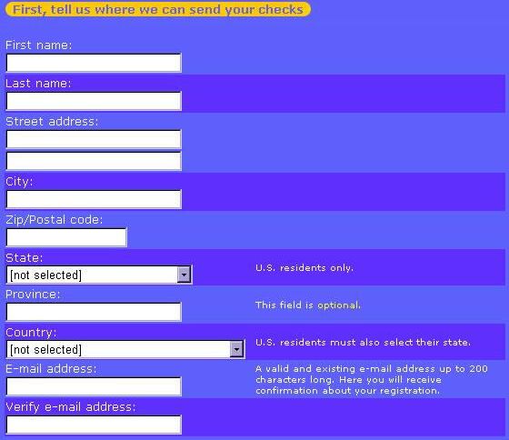 ★★登録フォーム★★ このような画面が表示されると思います。 Loginには、ログインに使いたい名前を入力します。3文字以上の半角英数字を入力して下さい。 Passwordにはログインに使いたいパスワードを入力します。4文字以上の半角英数字で入力します。 大文字、小文字は区別されるので気を付けましょう。 Verify passwordには上で入力したものと同じパスワードをもう一度入力します。 First nameにはあなたの下の名前を入力します。(例:山田太郎の場合、 Taro と入力) Last nameにはあなたの名字を入力します。(例:山田太郎の場合、 Yamada と入力) Street addressにはあなたの住所のうち都市名より下を入力します。 (例:東京都大田区北馬込1−1−1 井上マンション201の場合、 201 Inoue−Mansion 1−1−1 Kitamagomeと入力) Cityにはあなたの住んでいる都市名を入力します。 (例:東京都大田区に住んでいる場合、Ota-kuと入力) Zip/Postal codeにはあなたの郵便番号を入力します。 Stateは選択する必要ありません。 これはアメリカの州の選択だからです。 Provinceには都道府県名を入力します。 Countyは在住国です。Japanを選択します。 E-mail addressにはメールアドレスを入力します。 登録の通知が届きます。 Verifye e-mail adodress にはもう一度メールアドレスを入力します。 次に小切手の送付先などの情報を入力します 。 ここではいくつかの個人情報を入力します。 Age はあなたの年齢を選択します。 Genderはあなたの性別選択します。(女性:Female,男性:Male) Educatiomはあなたの学歴を選択します。 (高校:High School、大学:College、大学院: graduate degree、その他: Other) Annual household income あなたの家の年収です。 Iess than $20.000 約240万円以下 $20.000約-$34.999約420万円以下 $35.000−$49.999約600万円以下 $50.000−$69.999約840万円以下 $70.000−$89.999約1080万円以下 over $90.000約1080万円以上 ☆☆次ページ☆☆ |
