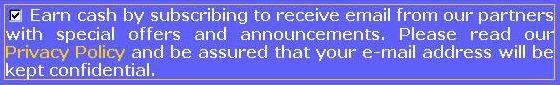 ※※重要※※ 現在、学歴と年収の下に仕事の業種と職種が追加されていますが、 翻訳しても分からない場合や主婦の方は、両方とも『other』でも大丈夫です。 この文の下にはたくさんのチェックボックスが並んでいると思います。 該当するものにチェックします。面倒な人は全てにチェックをしてしまいましょう。 登録エラーが発生する人はどこにもチェックが入っていない場合が多いです。 質問の内容は以下の通りです。 Please tell us why you use Internetは『インターネットの利用目的は?』 What do you search for or buy onlineは『インターネットで何を調べている、もしくは探していますか?』 この部分はチェックボックスをチェックしておくと、広告メールが送られてきて、ポイントが稼げます。 チェックをしておいた方が得です。 キャッシュフィエスタの場合は自分で設定した支払金額を超えると小切手が送られてきます。 ここでは支払最低金額を選択できます。 支払いが小切手で行われるため、できる限りため込んだ方が得をします。 ちなみに私は 200$ に設定をしています。この額は後からでも変更できます。 ※支払金額の変更はトップページからログインした後に Edit Profileと書いてあるボタンをクリックします。 登録画面で登録したのと同じ項目が並んでいるので、ここを探して変更してください。 設定の変更は一番したの Update Profile というボタンを押す事で有効になります。 最後にこのチェックボックスにチェックを入れて、 Submit Registration と書いてあるボタンを押しましょう。 このチェックボックスにチェックを入れるのは会員規約を読みましたというものです。 他のプログラムと同様なので、今更読むほどの内容ではありませんが、 心配な方はMember Agreementをご覧下さい。 記入に不備がなければ、 Confirmation of Your Registration Congratulationsあなたの名前 Now you can start making money with Cashfiesta:CLICK HERE というメッセージが表示されれば、登録完了です。 変わらない場合は、入力にエラーがあります。 大抵はログインIDが既に登録されていますというエラーになりますので、 ログインIDを別の登録されていないものに変更してみて下さい。 ★★次のページ★★ |